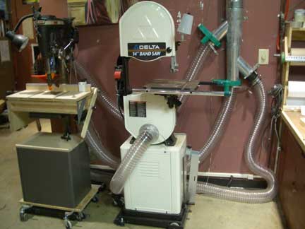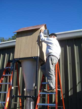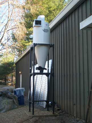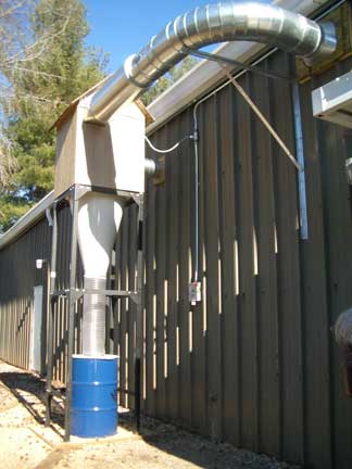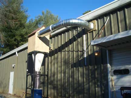 Some statistics about the system: The cyclone motor is a 16 inch air foil design and running at 7.5 horse power direct drive with a CFM of 2,700 at 8 inches of static pressure. The spiral pipe is 12" at the outlet, 10" at the inlet. There is just over 150 feet of spiral ductwork, graduating from 10" to 4". There is 260 sq. ft. of spun bonded polyester filter media which captures 99.9% of particles down to .2 microns in the returning air. The sound level (without muffler) is 82 Db at 10 feet and is 62 Db with the muffler. We are currently connected to the table saw, router, radial arm saw, band saw, drill press and 2 floor sweeps. Connections to come (which was provided for in the design and is in place now - just waiting for the connections to be made) will allow for joining the chop saw, lathe, mini tools, sanding stations and other creators of dust to the system. Gene has arranged for some quick disconnects which will allow us to move some of the shop tools around and still be connected to the dust collection systrem.