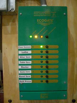 The cyclone dust collector motor unit, spiral pipe and connectors were supplied by Oneida Air Systems of Syracuse, NY. The electronic blast gates and controllers are from Ecogate of Glendale, CA.