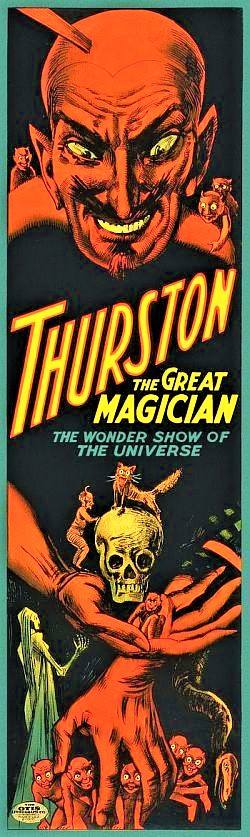 The Image of the sagacious magician looking knowingly at the viewer with small imps whispering the enduring secrets of magic in his ear has been often used on magician's advertising posters. This image of the magician getting the "secrets" from these underworld demi-devils apparently started with Harry Kellar (on his 1894 poster). Leon Hermann (nephew of Alexander) who overlapped the career of Kellar seems to be the first who copied the whispering imps. Not only did the Great Hermann include them, he used more imps! Several of the imitators have been satisfied with a single informant but the standard seems to be two - one per shoulder. Keen's informant is a great deal older - and may be Mr. Scratch himself. The poster that is probably the most famous and the one most often directly copied is the splendid Kellar poster. Thurston seemed to like the idea so much he used it three times, Raymond had two slight variations. It was used once on a book cover. Although many have directly copied Kellar's imps (myself included), the wee devils show up with tails, wings, pointed ears and in the company of other underworld creatures. Banachek has updated the imps as space aliens. I do not pretend to be a scholar on the subject of magic posters. I simply have been intrigued by the proliferation of the whispering imp images and have attempted to locate as many as I could. I am indebted to Jim Steinmeyer, James Hamilton, Scott Wells and others who have written thoughtful and helpful eMails assisting with the proper sequencing of these posters. The accumulator wishes to ESPECIALLY thank the extraordinary contributions made to this archive by the meticulous research by Eric Swenson. What follows is my accumulation of the variations on the theme (280mages!) |